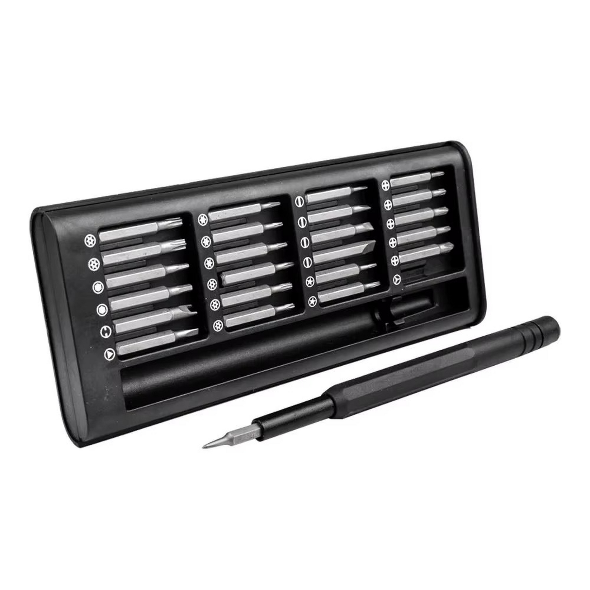 Ce coffret contient 24 embouts de précision en acier carbone magnétique, conçus pour intervenir sur les vis les plus fins et les appareils les plus délicats. Grâce à sa technologie magnétique, chaque embout se fixe solidement au tournevis pour une manipulation stable et sans glissement. Il ne se contente pas seulement de réparer. Il vous rend autonome, efficace, et prêt à agir à tout moment sans dépendre d’un réparateur ou d’un outil introuvable.